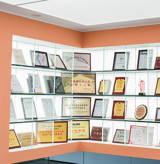 L'entreprise est titulaire des titres honorifiques de PME scientifiques et technologiques de la province du Zhejiang, d'Entreprises cloud de la province du Zhejiang, de Poste de travail postdoctoral de la province du Zhejiang, d'Entreprises « Spécialisées et Nouvelles » de la ville de Ningbo, de Centre de technologie d'ingénierie de la ville de Ningbo, d'Entreprises cotées au Centre de bourse de la ville de Ningbo, d'Usine verte de la ville de Cixi et du Top 50 de la production par acre de la ville de Cixi. Elle détient 123 brevets de différents types, est membre du Comité chinois de normalisation des appareils d'éclairage, participe à deux normes nationales et à sept normes de groupe, dispose de laboratoires témoins TUV et SGS, et a créé un centre commun de recherche et développement pour les produits d'éclairage intelligents et un centre de stage « industrie-université-recherche » avec l'Université de technologie appliquée de Shanghai.
